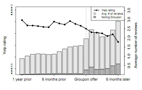 The researchers studied over 16,000 deals in 20 cities and collected data at ten-minute intervals while the each deal was active. In addition to collecting data directly related to Groupon deals, the researchers also analyzed over 56,000 Yelp reviews for 2,332 of the merchants who ran daily deals. The data from this study, which is bad news for both the $1 billion dollar daily deal business and merchants, indicates the following findings: Groupon offers correlate with a higher number of total Yelp reviews, but lower overall Yelp ratings, for a merchant who features a daily deal.